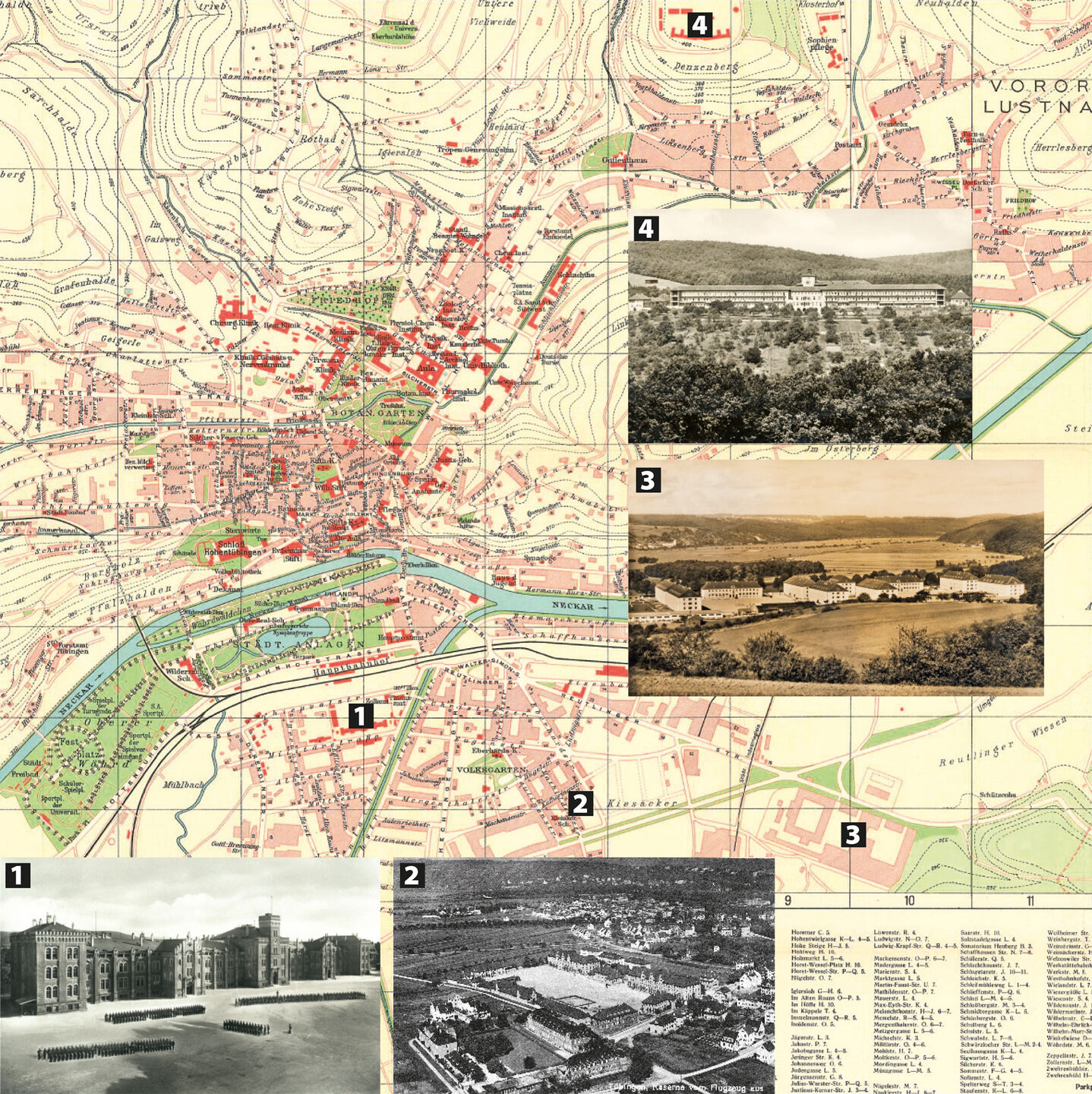 Karte: © Universitätsstadt Tübingen, Kartengrundlage: Amtlicher Stadtplan; Fotos: Stadtarchiv Tübingen