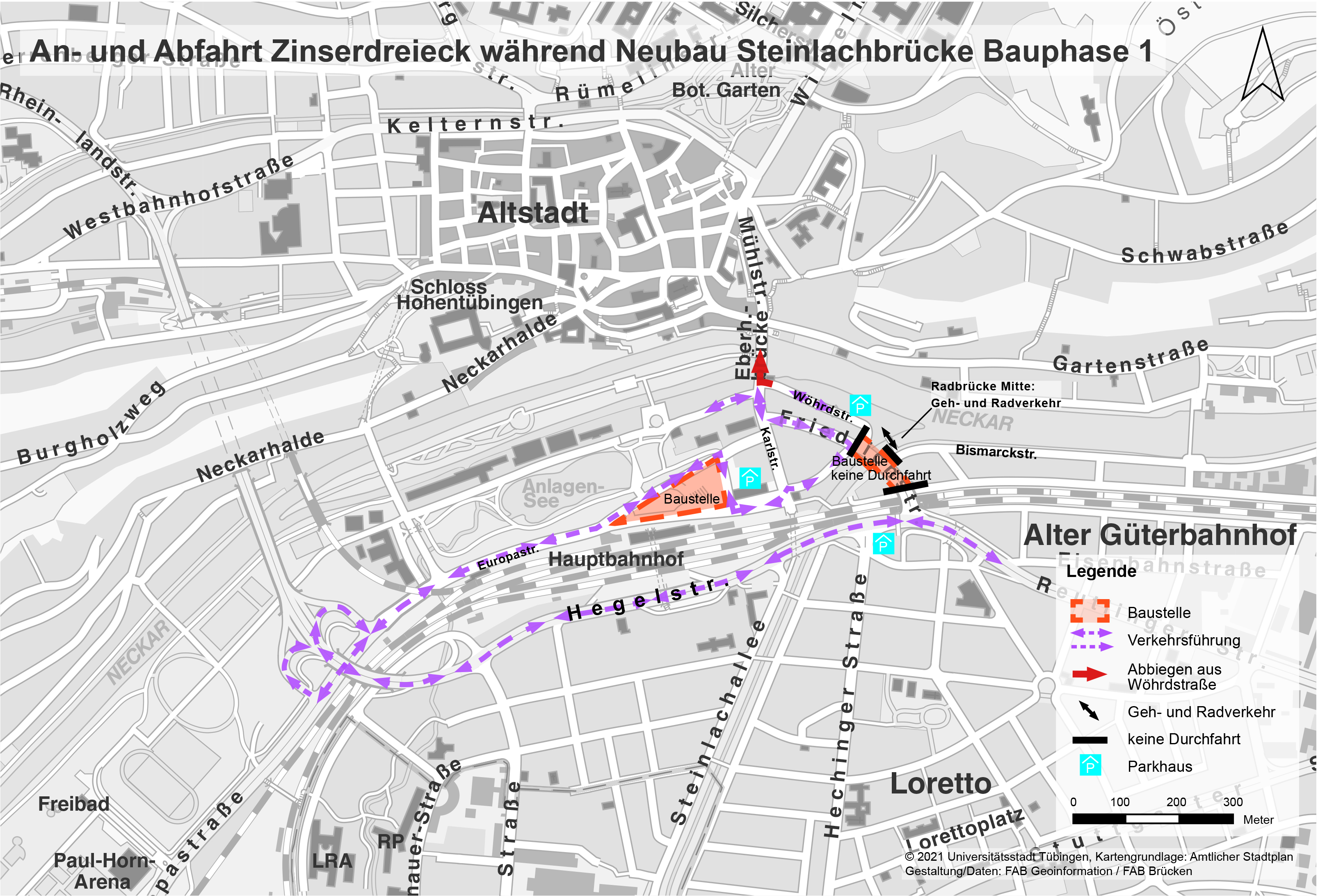 Die Steinlachbrücke zwischen Blauer Brücke und Friedrichstraße wird abgerissen und neugebaut. Die Bauarbeiten beginnen am Montag, 20. September 2021, und gehen bis Mitte/Ende November 2022. In dieser Zeit wird die Friedrichstraße im Brückenbereich voll gesperrt. Das bedeutet: Es können keine Kraftfahrzeuge über die Blaue Brücke ins oder aus dem Zinser-Dreieck fahren. Wer mit dem Fahrrad oder zu Fuß unterwegs ist, kann die Wöhrdstraße weiterhin von der Friedrichstraße aus erreichen, denn der Fußgänger- und Radverkehr wird über die neue Radbrücke Mitte geleitet.