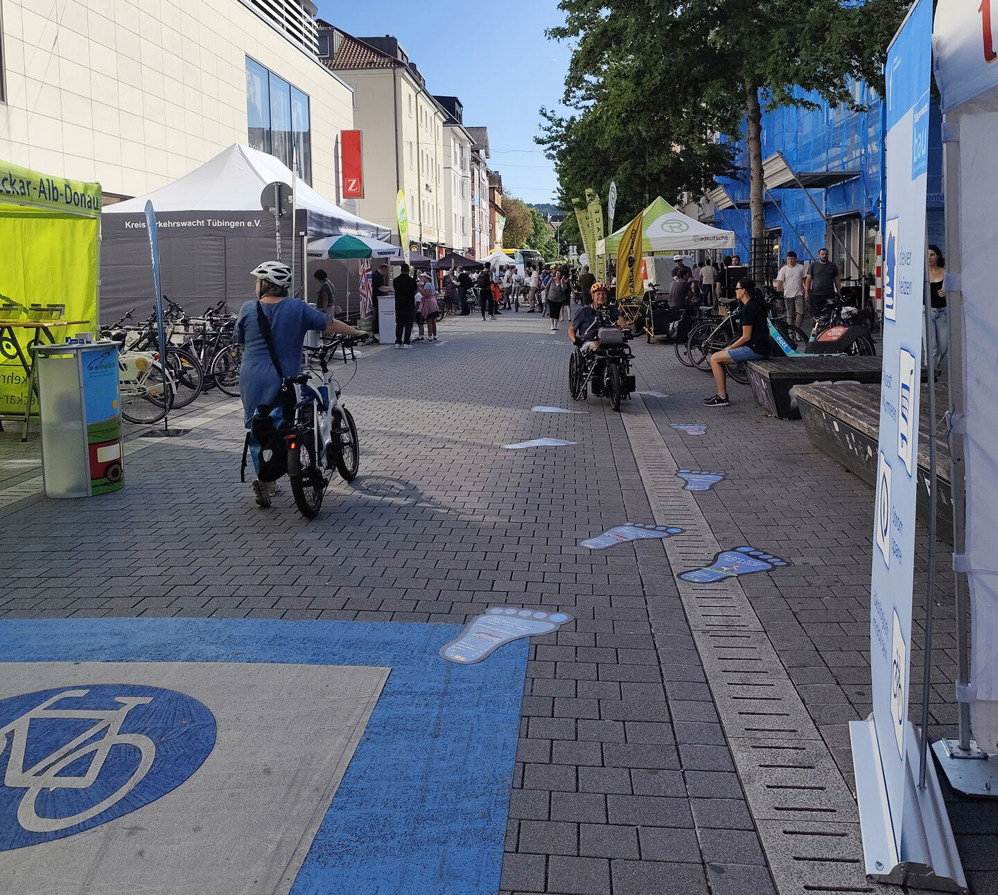 Auf der Entdeckermeile präsentierten neun Unternehmen und lokale Vereine sowie die Stadtverwaltung Tübingen Mitmach-Angebote, Probefahrten und Informationen rund um umweltfreundliche Mobilität. TeilAuto Neckar-Alb sowie die bhg Autohandelsgesellschaft präsentierten ihr Angebot an Elektroautos und die Stadtwerke (swt) warteten mit einem ganzen Elektrobus in der Fahrradstraße auf. Auch Lastenräder gab es bei der Radkutsche und bicicapace anzusehen und zu testen. Die Kreisverkehrswacht Tübingen informierte rund um das Thema Fahrradsicherheit inklusive einem Reaktions- und Sehtest. Bei der Stabsstelle Umwelt- und Klimatest konnte Groß und Klein ihr Mobilitätswissen unter Beweis stellen, oder beim Errechnen des eigenen Mobilitätsfußabdruckes einschätzen, wie nachhaltig man sich fortbewegt. Informationen zur Regionalstadtbahn lieferte die Pro RegioStadtbahn und auch Naldo gab Wissenswertes über den ÖPNV beim Wettpuzzeln weiter.