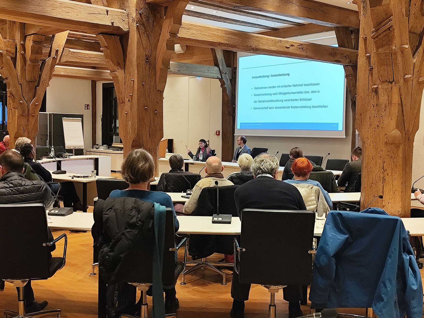 Am Dienstag den 18. November 2025 fand ein Vortragsabend im Rathaus am Markt im Ratssaal statt. Die rund 30 Anwesenden informierten sich über das Thema energetische Sanierung in Wohnungseigentümergemeinschaften (WEGs).