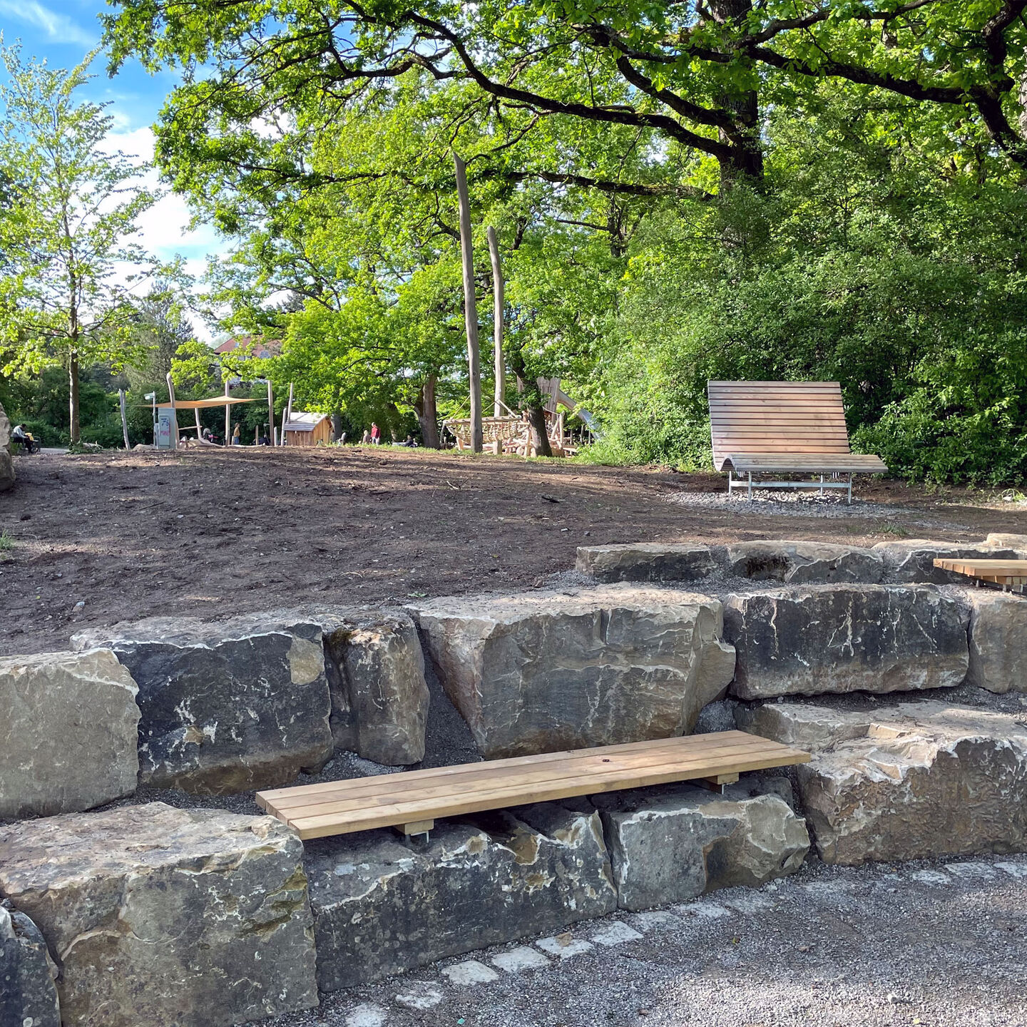 - für alle: Wasserspielbereich, Schaukeln, Seilbahn, Verstecke zum Weiterbauen im Übergang zum Wald, offene Spielwiese